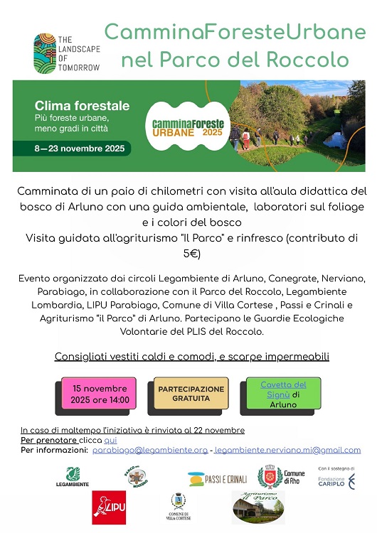 In occasione dell'iniziativa "Cammina Foreste Urbane", promossa da Legambiente Lombardia e ERSAF, il Parco del Roccolo propone una camminata guidata di un paio di chilometri sui sentieri del Parco fino al bosco di Arluno; in programma anche laboratori sul foliage e colori del bosco.