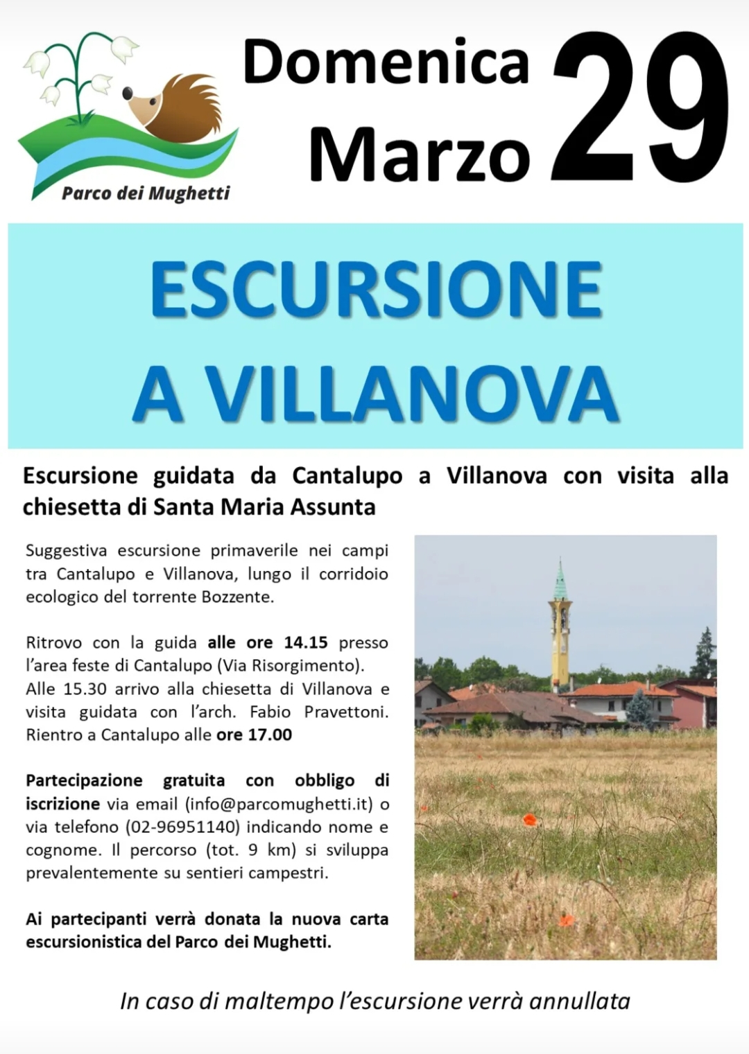 Il Parco dei Mughetti organizza un'escursione guidata da Cantalupo a Villanova, lungo il corridoio ecologico del torrente Bozzente, con visita alla chiesetta di Santa Maria Assunta.