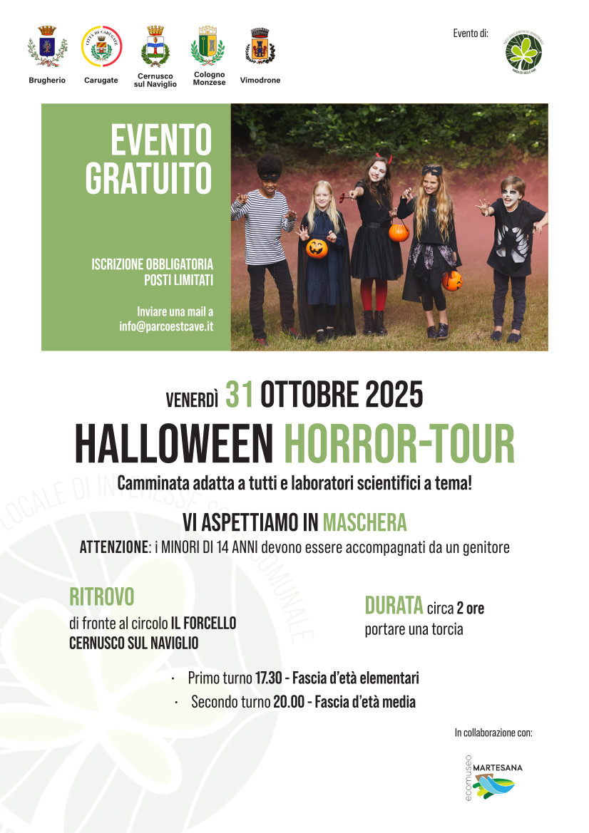 Il Parco Est delle Cave organizza per venerdì 31 ottobre 2025 "Halloween Horror-Tour": camminata adatta a tutti e laboratori specifici a tema.