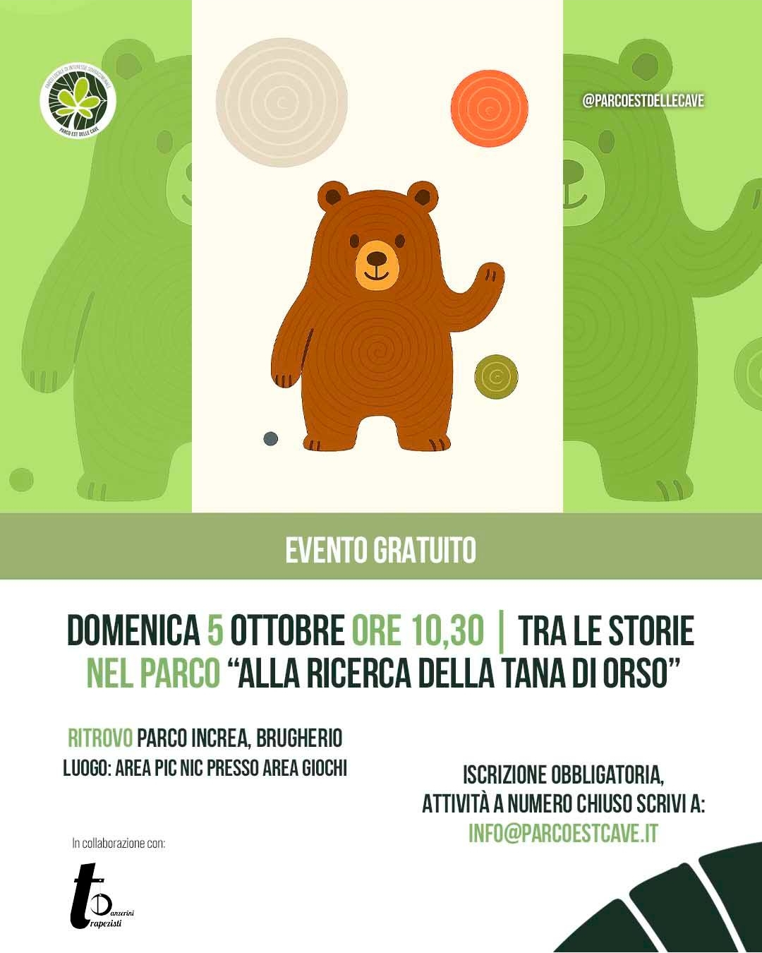 Il Parco Est delle Cave organizza il "Tra le storie nel Parco - Alla ricerca della Tana di Orso": un racconto fatto di suoni, colori, incontri e paesaggi, a cura di Chiara Marzetta. Attività di coinvolgimento per bambini e bambine da 0 a 3 anni.