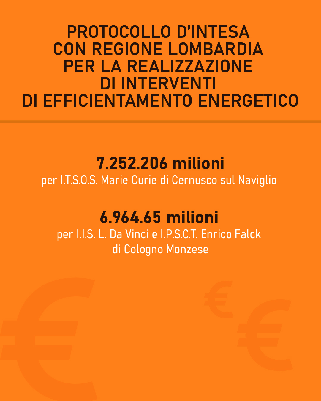 - I.I.S. L. Da Vinci - I.P.S.C.T. E. Falck Cologno Monzese: 6.964.658 euro.