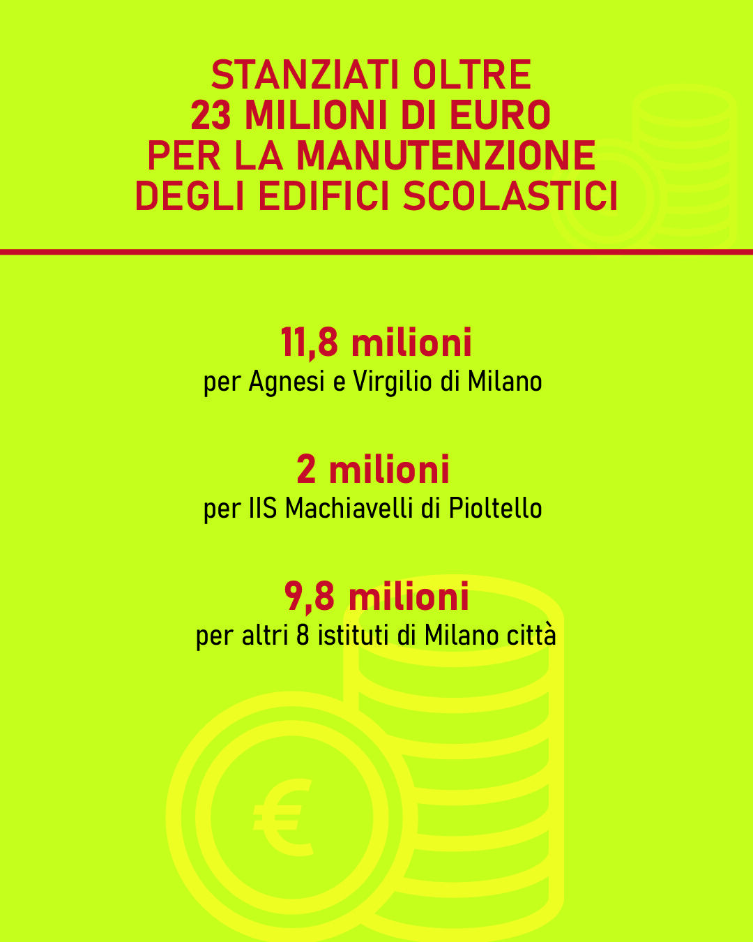 - Istituti "Agnesi" e "Virgilio" di Milano 11.870.000 euro, di cui 3.870.000 euro corrisposti dal Comune di Milano, con interventi realizzati tramite convenzione tra la Città metropolitana (attuatore degli interventi) e il Comune di Milano;