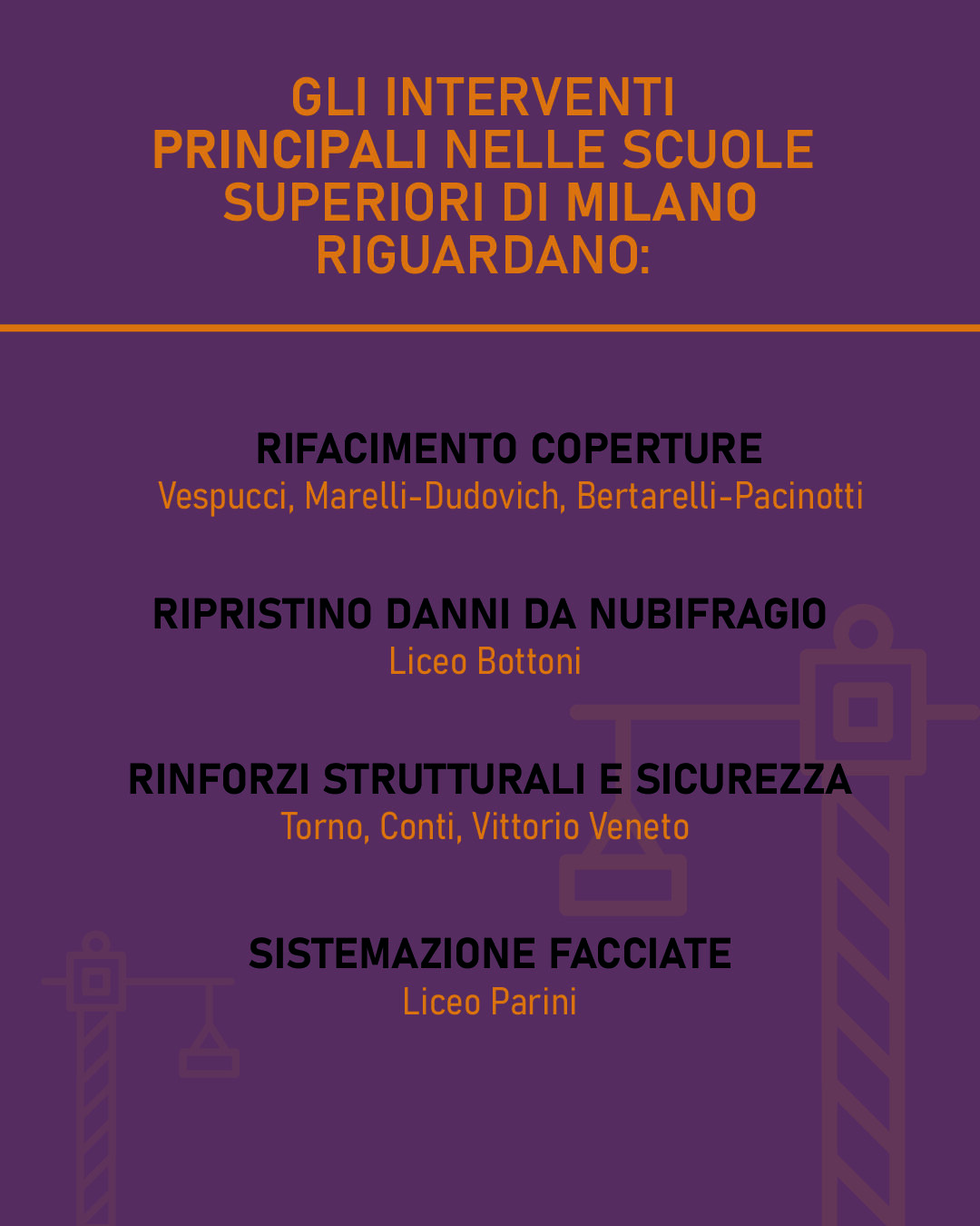 - IIS "Bertarelli–Pacinotti", succursale via G. Romano (Milano) per il rifacimento di controsoffitti e ricorsa copertura – 1.000.000 euro;